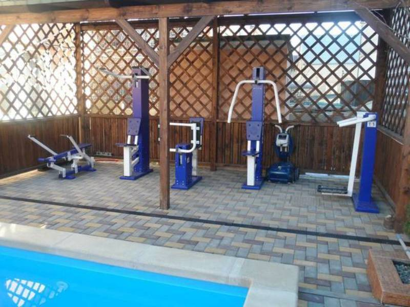 - зона бассейна включает в себя сам бассейн с подогревом, площадью 26 кв.м. (3,5 х 7,5), а также открытую площадку с шезлонгами для загара. Под теневым навесом установлены пять тренажеров для занятия спортом.