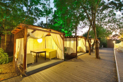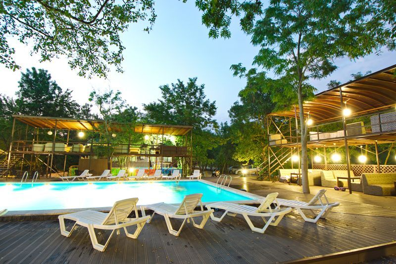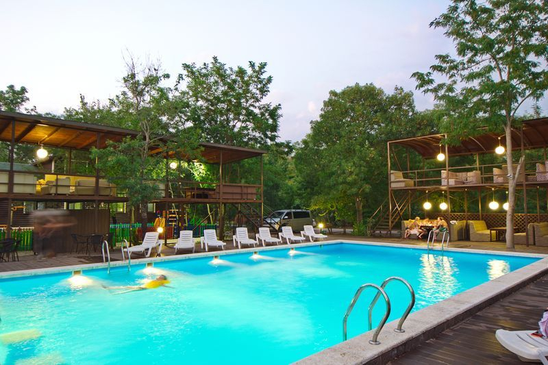 На территории также находится два бассейна 16х8 м с баром и 12х4 с детской зоной, две чилаут зоны с современной ротанговой мебелью и лежаками, бар с множеством прохладительных напитков, мини-беседки для отдыха и парковочные места под видеонаблюдением. Доброжелательный персонал будет рад встретить гостей и создаст все необходимые условия для полноценного и качественного отдыха.