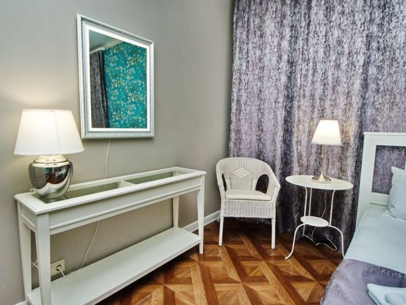 | Мебель: | двуспальная кровать, шкаф, стол, прикроватные тумбочки, кресла, вешалка, зеркало |