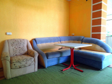 | Мебель: | односпальные или двуспальная кровати, диван-кровать, шкаф, прикроватные тумбочки, журнальный столик, вешалка, зеркало |