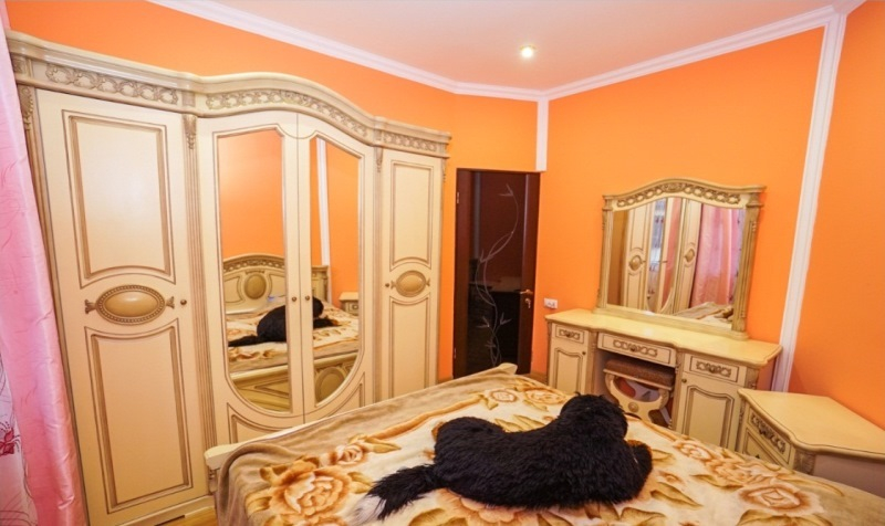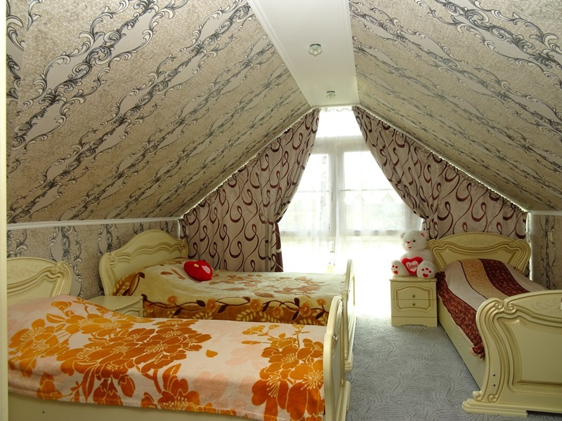 | Мебель: | односпальные или двуспальная кровати, кресло-кровать, шкаф, пуфики, прикроватные тумбочки, туалетный столик, комод, вешалка, зеркало |