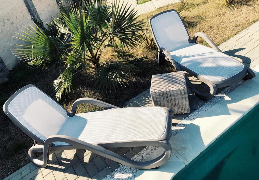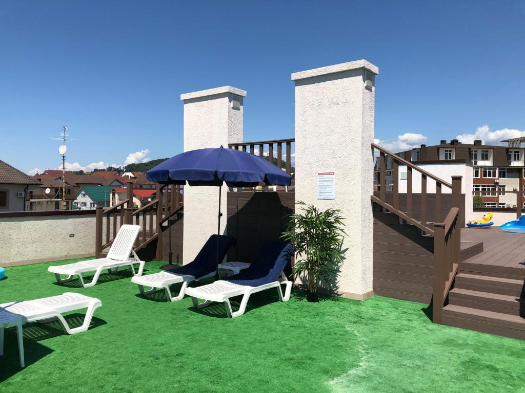 Построена в 2018 году в стиле High-Tech с большими панорамными окнами и отдельными входами в номера на 1 этаж.