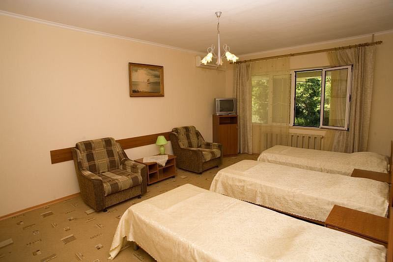 | Мебель: | 3 односпальные кровати, кресла, стулья, шкаф, прикроватные тумбочки, журнальный столик, комод, вешалка, зеркало |