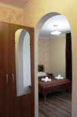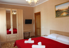 | Мебель: | односпальные и двуспальные кровати, кресло-кровать, шкаф, стулья, прикроватные тумбочки, журнальный столик, стол, зеркало, кухня в номере |