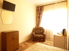 * 4 номера "Повышенной комфортности" - большие, просторные номера 2х-3х-4х-местные, в номерах: кровати с ортопедическими матрацами, шкаф, тумбочка, бра, зеркало, ковровое покрытие, телевизор, холодильник, чайник, посуда, кондиционер, санузел в номере.