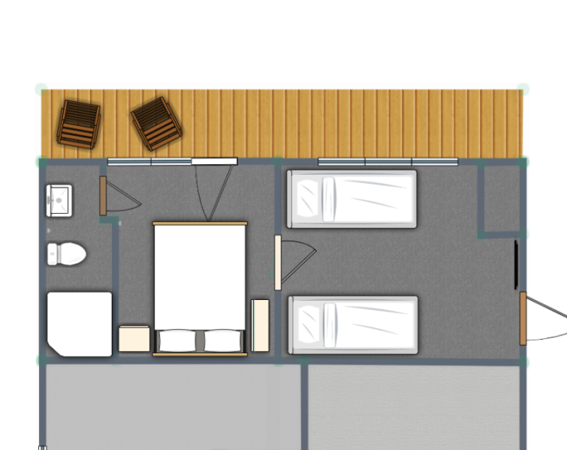 | Мебель: | двуспальная кровать, стулья, пуфики, прикроватные тумбочки, журнальный столик, комод, вешалка, зеркало |