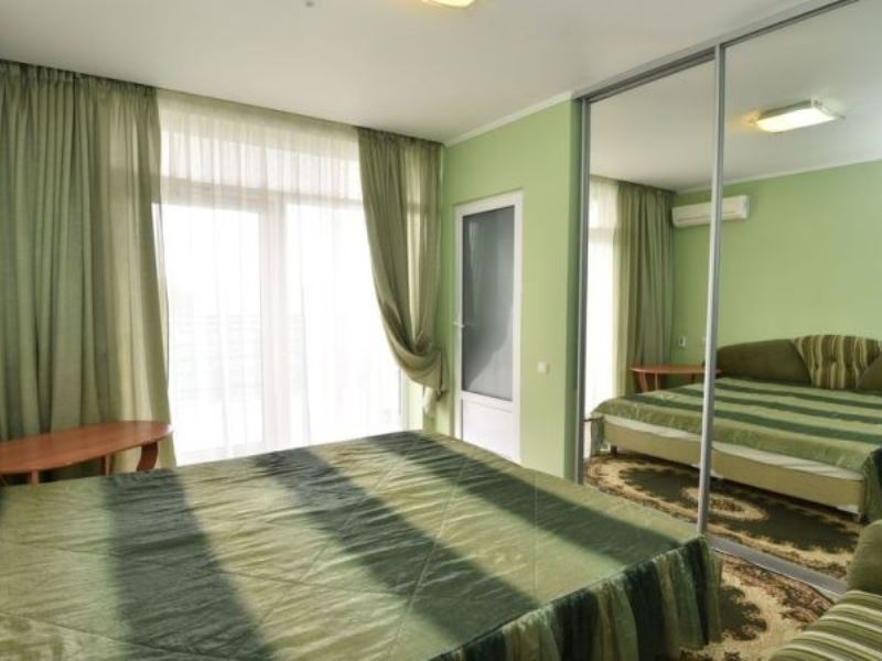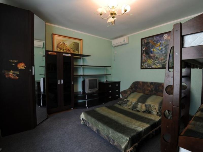 | Мебель: | односпальные или двуспальная кровати, диван-кровать, шкаф, стулья, пуфик, прикроватные тумбочки, журнальный столик, комод, кухня |