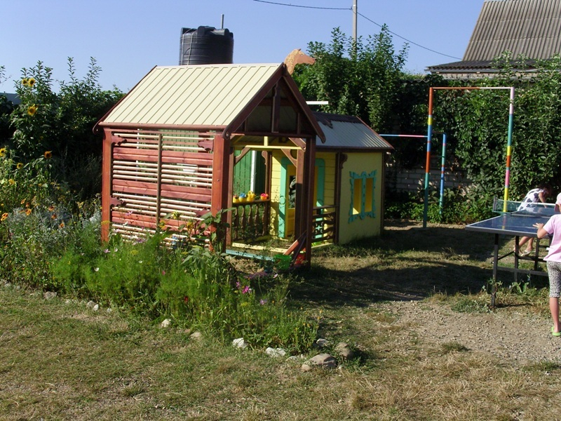 Для отдыха детей и взрослых предусмотрена отдельная зона, в которой расположен теннисный стол, детский домик, песочница с игрушками, защищенная от прямых лучей солнца, перекладинами, большой качелей, декоративным колодцем, симпатичным прудиком с фонтанчиком - это самое любимое место игр детишек.