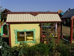 К размещению предлагаются отдельные 3х, 4х и 5-местный домик, комната-студия с кухней, и двухкомнатный номер с кухней. Домики справа имеют два входа и две веранды (спереди и сзади). Каждый домик имеет свою отделенную (от посторонних глаз) зону отдыха. На ней есть клумбы с цветами и пряной зеленью, крытая веранда с качелей и застольной мебелью. Во всех домиках имеются комплекты посуды, столовые приборы и чайник.