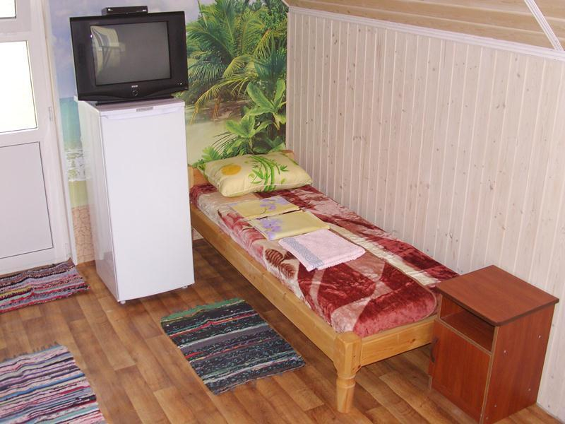 В каждом домике свой санузел (душ, унитаз, раковина), одно, либо двухъярусные кровати, прикроватные тумбочки, стеллаж, холодильник, телевизор. Постельное белье с двумя полотенцами на каждого гостя меняется раз в неделю по желанию гостя.