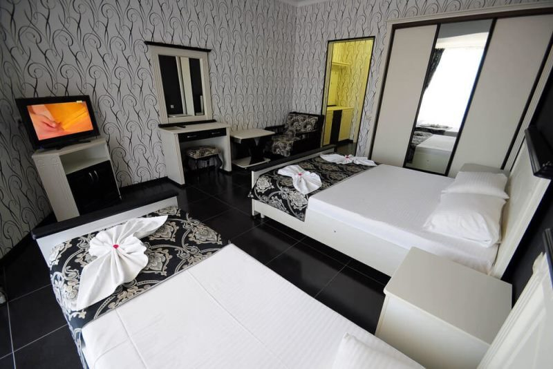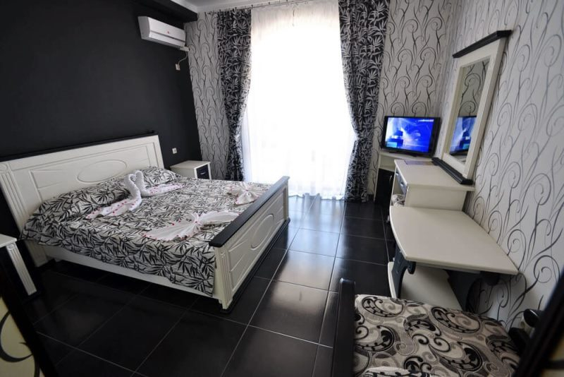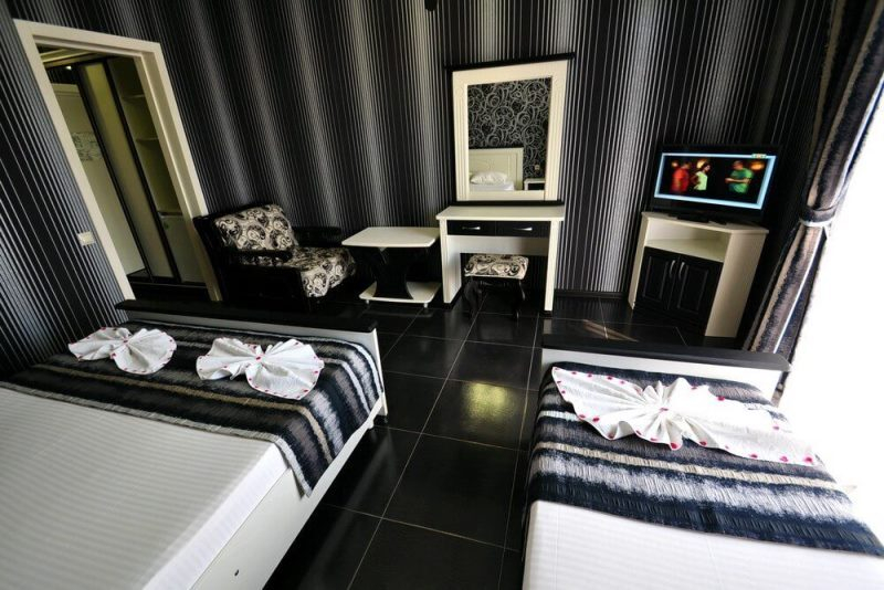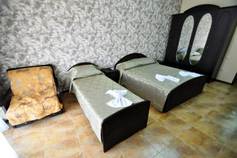| Мебель: | односпальные и двуспальная кровати, диван-кровать, шкаф, прикроватные тумбочки, туалетный столик, журнальный столик, зеркало |