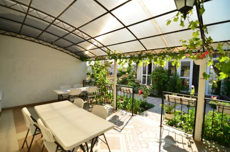 Территория гостевого дома "Анастасия" закрыта для посторонних. Внутренний двор радует глаз свежим зеленым газоном, яркими цветочными клумбами, экзотическими растениями.