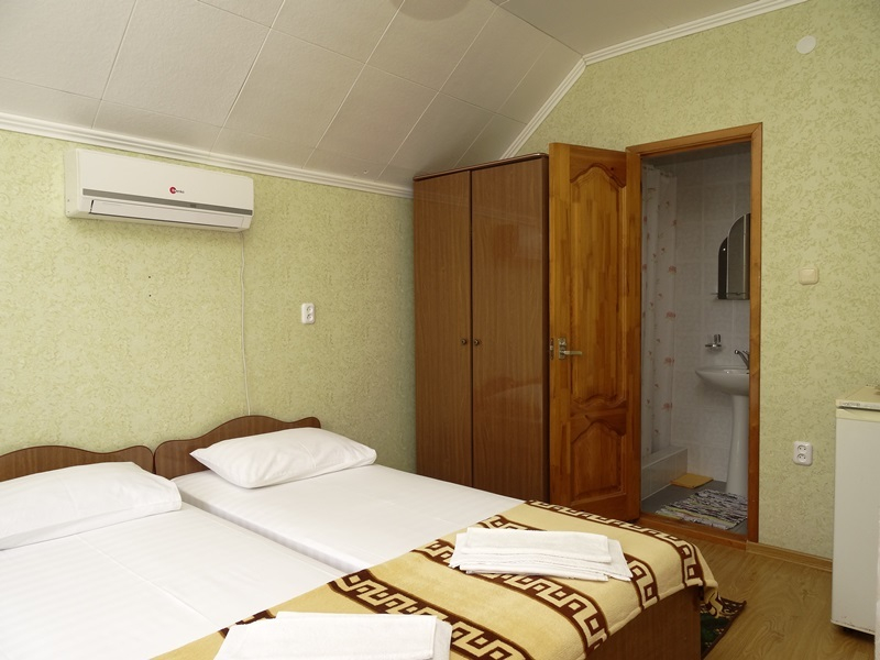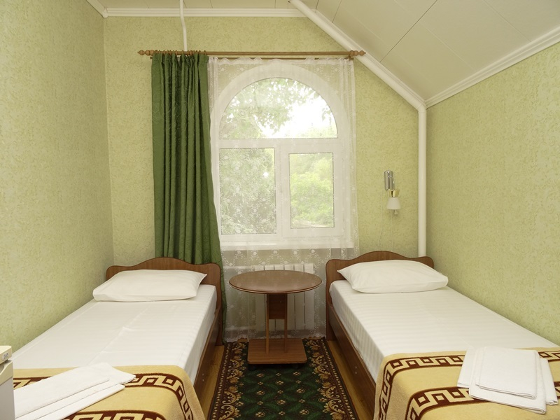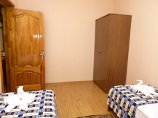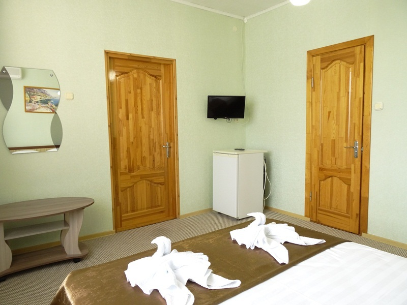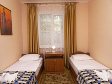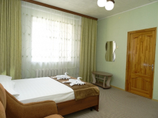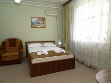 | Мебель: | односпальные или двуспальная кровати (ортопедические матрасы, белое сатиновое белье), шкаф, стулья, прикроватные тумбочки, журнальный столик, стол, зеркало |