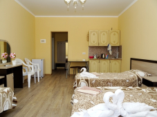 | Мебель: | новые и удобные односпальные или двуспальная кровати, шкаф, стулья, прикроватные тумбочки, журнальный столик, туалетный столик, прихожая, зеркало |