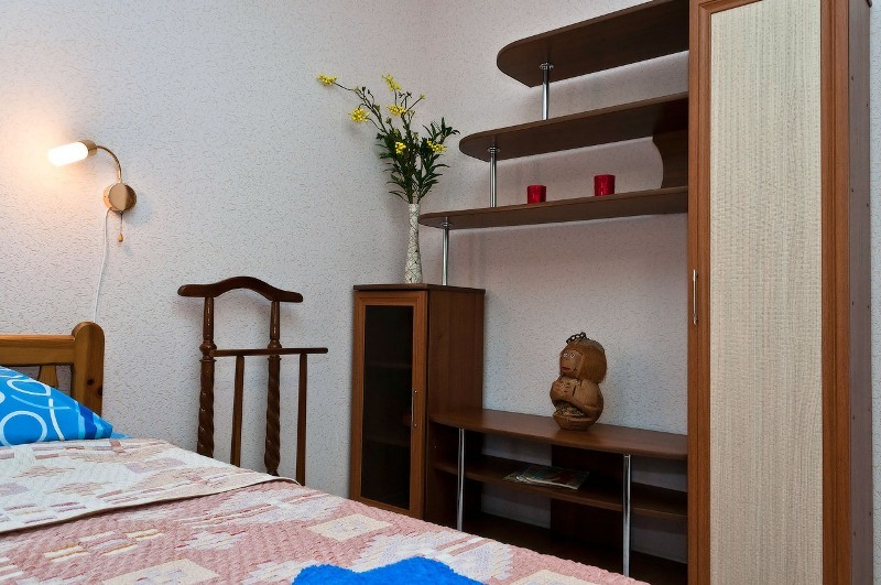 | Мебель: | односпальные или двуспальная кровати, диван-кровать, шкаф, прикроватные тумбочки, журнальный столик, зеркало, кухонный гарнитур, обеденная зона (на балконе) |