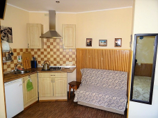 | Мебель: | двуспальная кровать, кресло-кровать, стулья, стол, вешалка, зеркало, кухонный гарнитур, обеденная зона |