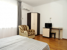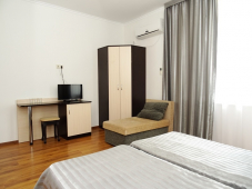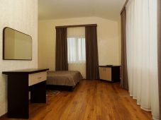 | Мебель: | односпальные или двуспальная кровати, стулья, шкаф, прикроватные тумбочки, вешалка, зеркало |