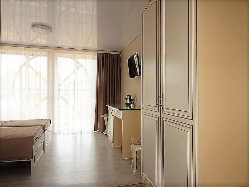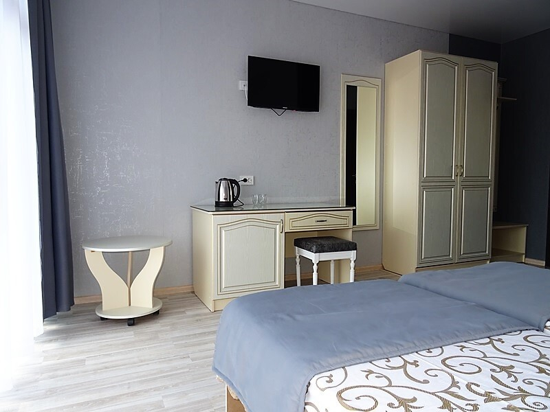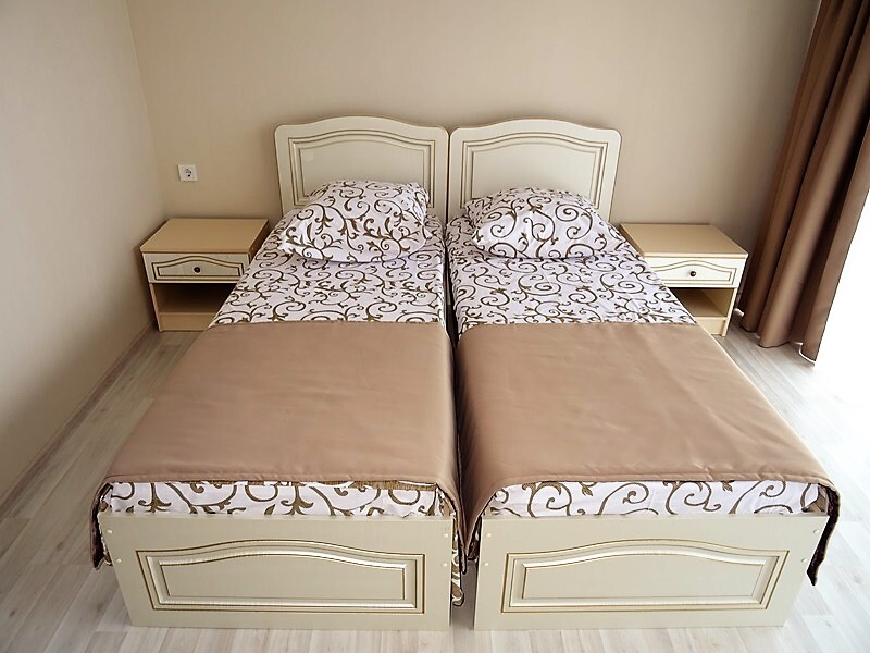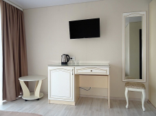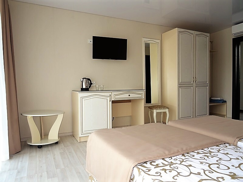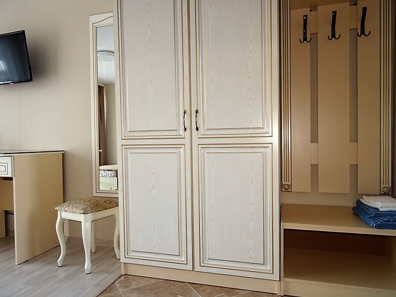 | Мебель: | 2 односпальные или двуспальная кровати, стулья, стол, журнальный столик, прикроватные тумбочки, шкаф, туалетный столик, прихожая, вешалка, зеркало |