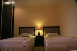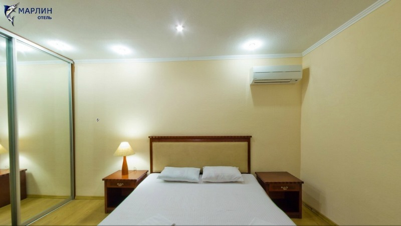 | Мебель: | 2 односпальные или двуспальная кровати, диван-кровать, шкаф, кресла, прикроватные тумбочки, кофейный столик, вешалка, зеркало |