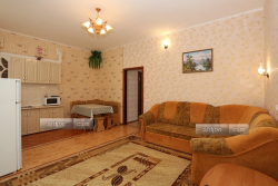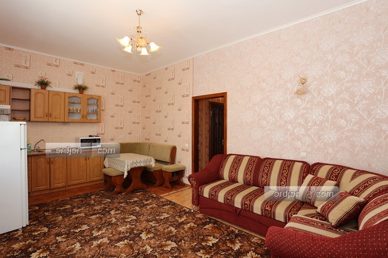| Мебель: | односпальные и двуспальная кровати, диван-кровать, стулья, шкаф, прикроватные тумбочки, стол, журнальный столик, вешалка, зеркало, кухонный гарнитур, обеденная зона |