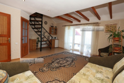 | Мебель: | двуспальная кровать, диван-кровать, шкаф, стулья, прикроватные тумбочки, стол, вешалка, зеркало, кухонный гарнитур, обеденная зона, на террасе деревянная мебель, фонтанчик |