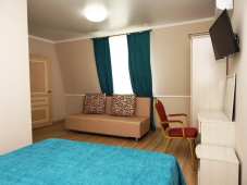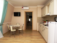 | Мебель: | двуспальная кровать, 2 диван-кровати, шкаф, стулья, прикроватные тумбочки, зеркало, кухонный гарнитур, обеденная зона |