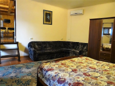 | Мебель: | 2 односпальные и двуспальная кровати, 2 диван-кровати, стулья, пуфики, шкаф, прикроватные тумбочки, стол, вешалку, зеркало, кухонный гарнитур, обеденная зона |