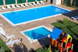 Гостиница имеет развитую инфраструктуру в составе открытых бассейнов для взрослых и детей, кафе «Барин», детской площадки и парковки.