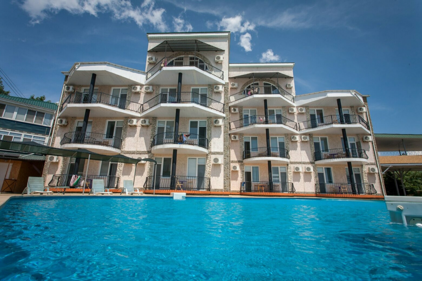 | К Вашим услугам (дополнительно) | На территории комплекса расположены бассейн с подогревом на солнечных батареях, шезлонги, детская игровая площадка, бесплатная охраняемая парковка на 20 мест, услуга Wi-Fi, бильярд, настольный теннис, мангал и уютные беседки. |