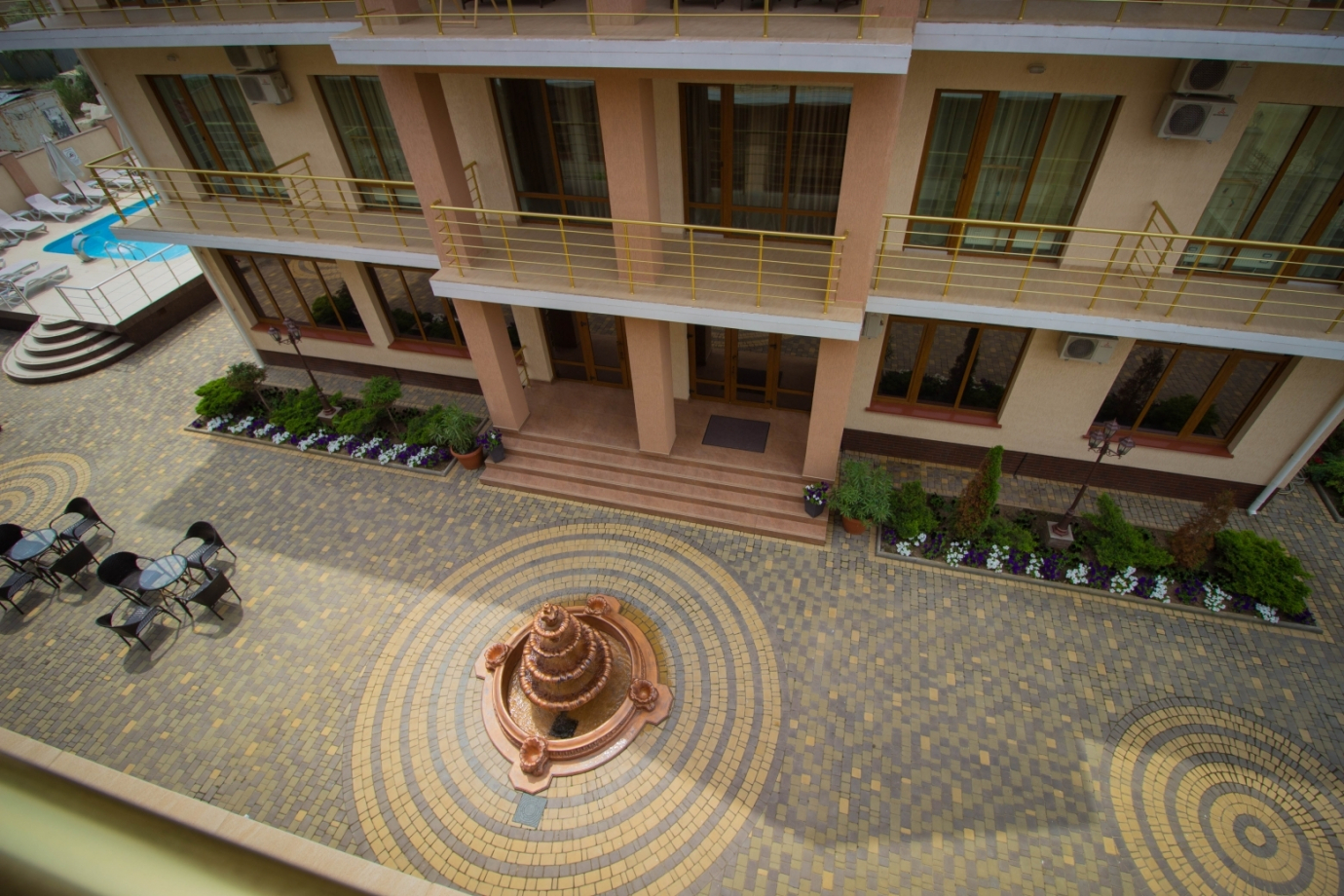 | Инфо: | Номера состоят из спальной и ванной комнат. В номерах – холодильник (мини-бар), спутниковое телевидение, WI-FI интернет, кондиционер, сейф, картина, шкаф-купе с зеркалами. Паркетное покрытие. В ванной комнате – душевая кабина, туалет, туалетное зеркало, фен, предметы гигиены. Индивидуальные балконы, оснащенные столиками и стульями. |