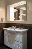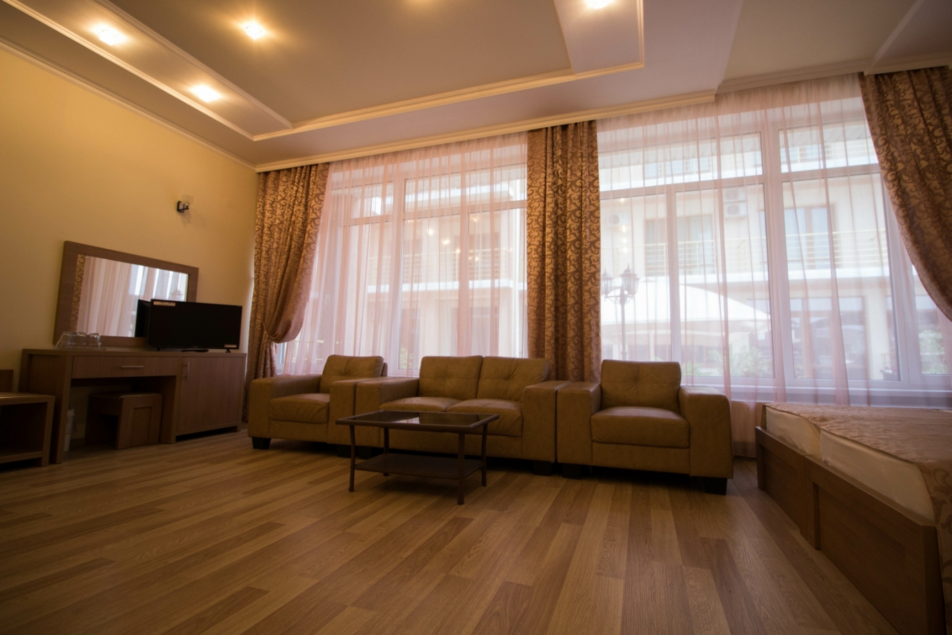 | Инфо: | Улучшенная планировка, комфортабельная мебель, а также диван, два кресла, журнальный столик, наличие балкона. В номерах – холодильник (мини-бар), спутниковое телевидение, телевизионные каналы, WI-FI интернет, кондиционер, сейф, картины, шкаф-купе с зеркалами. Паркетное покрытие. В ванной комнате – угловая ванна, туалетный столик, фен, тапочки и предметы гигиены. Индивидуальные балконы, оснащенные столиками и стульями. |