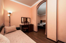 | Мебель: | 2 односпальные кровати, двуспальная кровать, диван-кровать, стулья, шкаф, прикроватные тумбочки, журнальный столик, туалетный столик, комод, вешалка, зеркало |